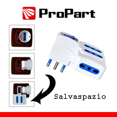 • Adattatore 4 posti SALVASPAZIO: 4 prese bipasso 10/16A 2P+T, spina 16A 2P+T posizionata verticalmente, Bianca