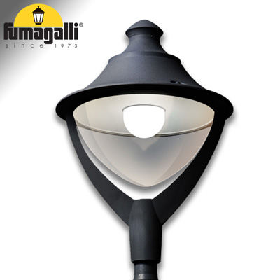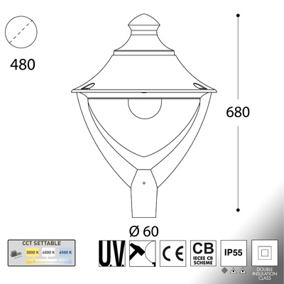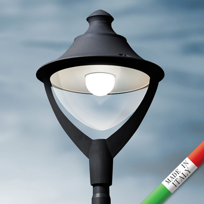 Luminaria moderna realizzata in materiale resina antiurto, stabilizzato ai raggi UV, resistente alla ruggine e alla corrosione. Adatta per installazione su colonna (post top). Fornita con soffitto resistente ad alte temperature, adatto per il fissaggio orizzontale della lampadina, e dotata di riflettore in alluminio per ottimizzare la distribuzione della luce. Progettata in conformità alle normative internazionali contro l'inquinamento luminoso (standard UNI 10819). Classe di isolamento II, grado di protezione IP55.