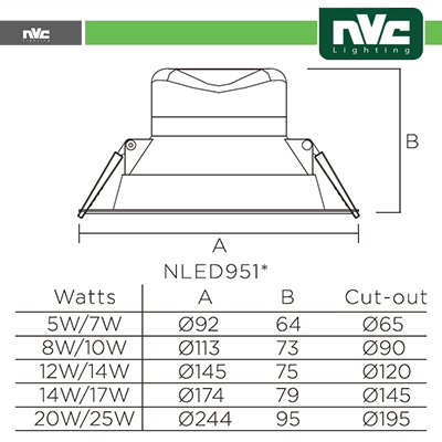 | NVLED9518 | 20w | 3000K | 1640 | AC 220-240V | 90° | Φ244/Φ195x95 |