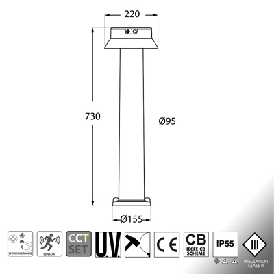 FELICE 800 NERO SOLAR LED Ø150 PIR CCT S - 73 cm