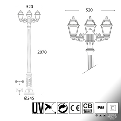 Con il lampione Gigi Bisso/Mary 3L, Fumagalli offre una combinazione perfetta di stile classico, resistenza superiore e illuminazione inclusa, garantendo prestazioni elevate e durature per ogni esigenza di illuminazione esterna.