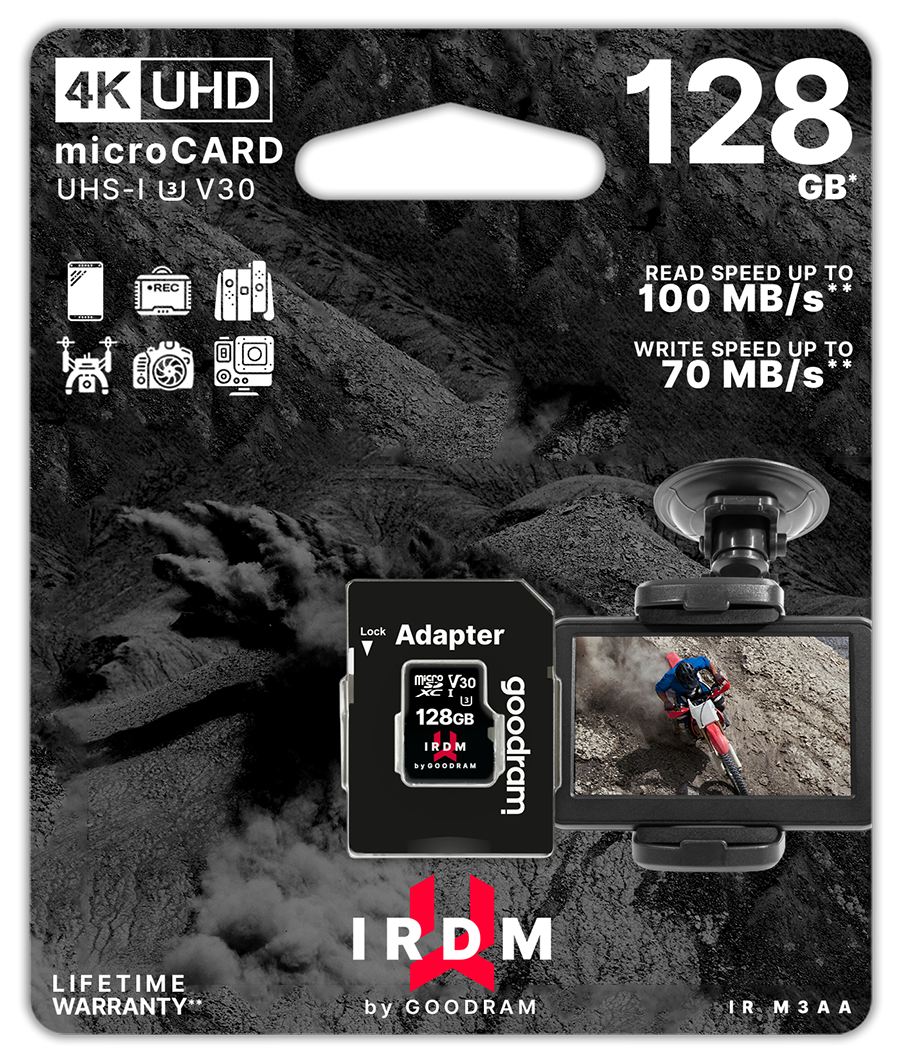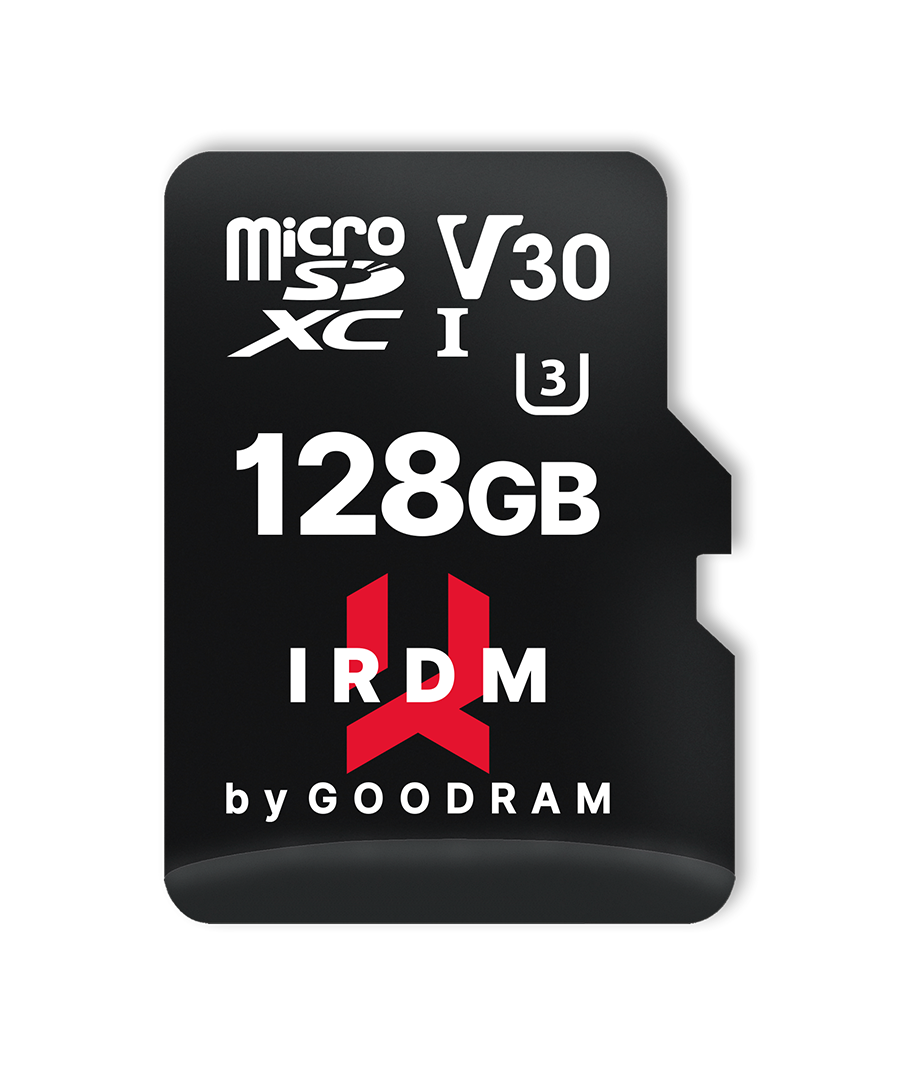 La microCARD IRDM UHS-I U3 offre prestazioni elevate e affidabilità per tutti coloro che desiderano fare video 4K e slow motion o scattare immagini JPEG / RAW di alta qualità in modalità burst veloce.