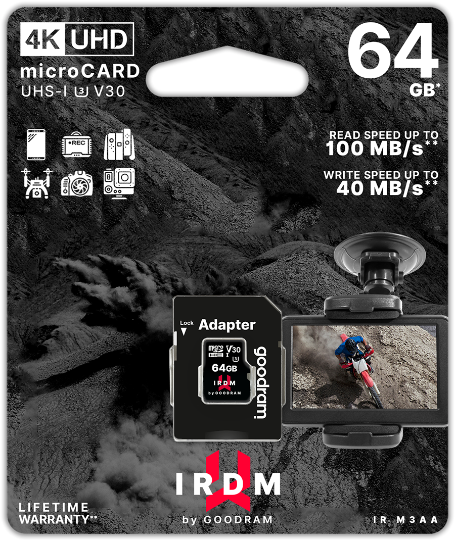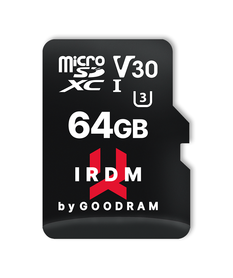 La microCARD IRDM UHS-I U3 offre prestazioni elevate e affidabilità per tutti coloro che desiderano fare video 4K e slow motion o scattare immagini JPEG / RAW di alta qualità in modalità burst veloce.