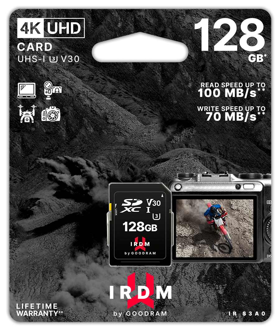 La microCARD IRDM UHS-I U3 offre prestazioni elevate e affidabilità per tutti coloro che desiderano girare video in 4K e slow motion o scattare immagini JPEG e RAW di alta qualità in modalità burst veloce.