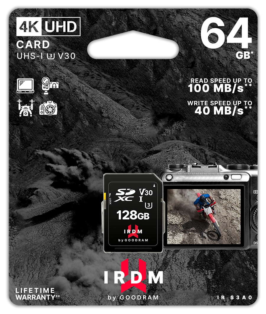 La microCARD IRDM UHS-I U3 offre prestazioni elevate e affidabilità per tutti coloro che desiderano girare video in 4K e slow motion o scattare immagini JPEG e RAW di alta qualità in modalità burst veloce.