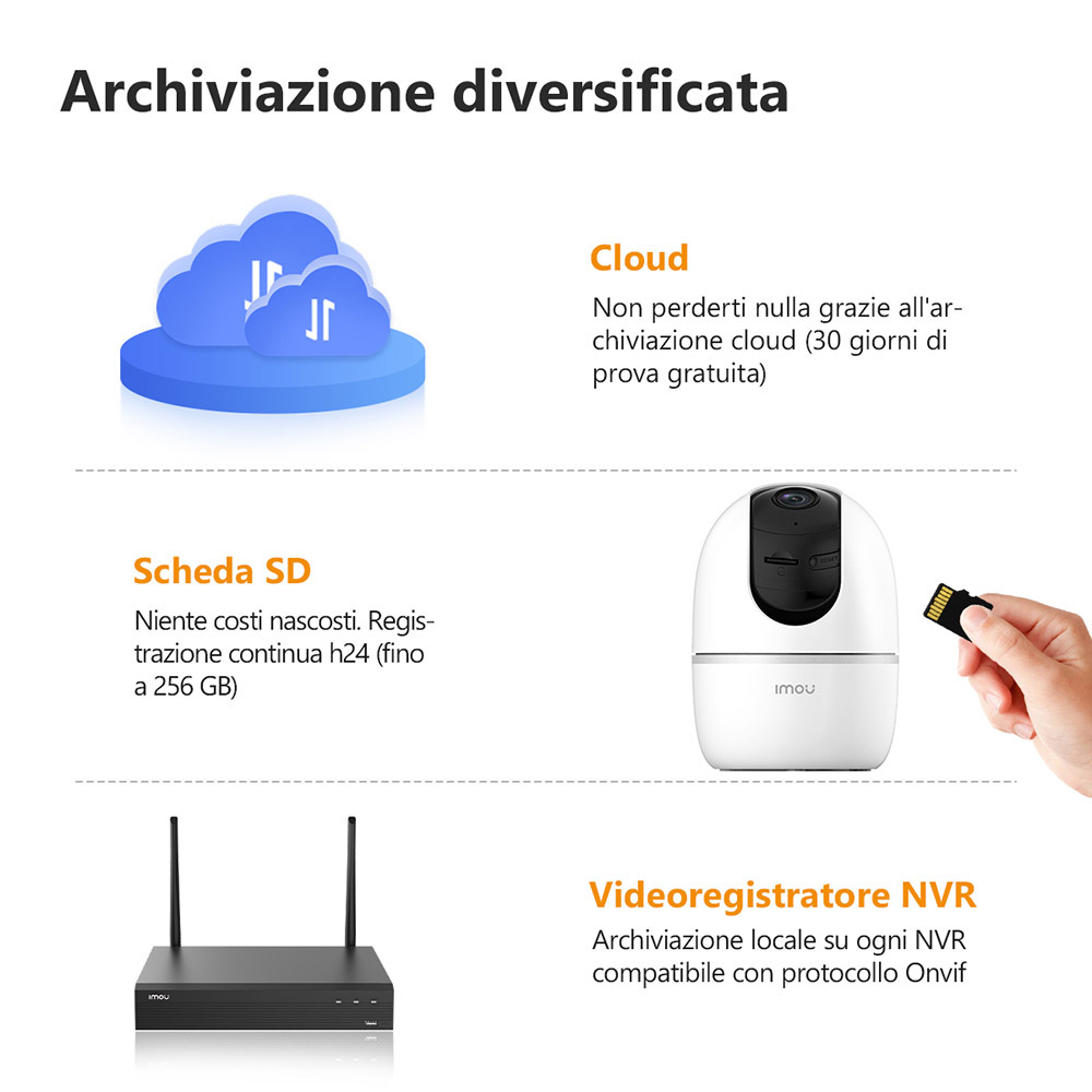 PAN 355° e TILT 80°, 1 porta LAN 100 Mbps, Wi-fi IEEE802.11 b/g/n portata fino a 50 m in campo aperto, app imou per iOS e Android,