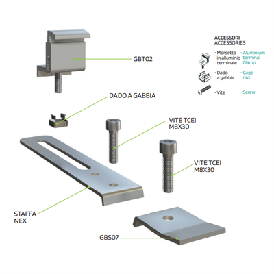 STAFFA 3 MM GBS06 + DADO A GABBIA GB010 + VITI TCEI M8X30 GB007 2 PZ + 1 MORSETTO TERMINALE UNIVERSALE “I” + STAFFA A GANCIO