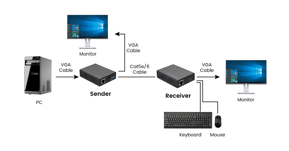 VGA Extender è un kit in bundle che include sia un trasmettitore locale e un'unità ricevente remota, che offre una soluzione completa per gli scenari in cui sono richiesti monitor remoti, offrendo la possibilità di visualizzare e dividere il segnale VGA sorgente su due display indipendenti. Consente inoltre di estendere il segnale video VGA fino a 300 metri tramite un cavo UTP standard. trasmette anche l'alta velocità USB 2.0 e i segnali di controllo allo stesso tempo, perfetti per controllare la tua sorgente video dalla tua destinazione video.