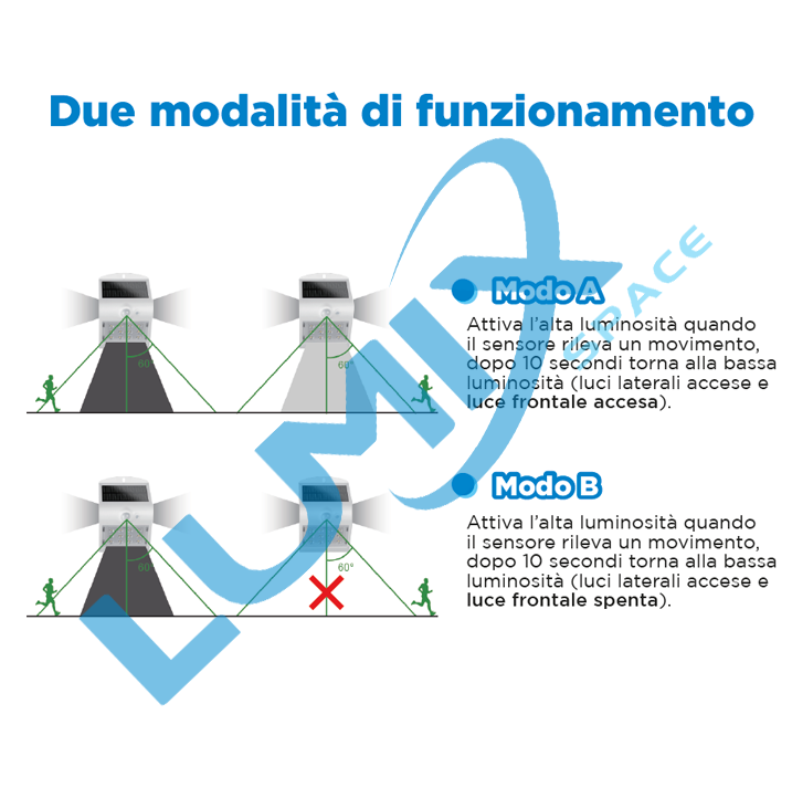 Per attivare la lampada basterà schiacciare il tasto nella parte frontale, e questa inizierà a funzionare autonomamente (stesso procedimento per spegnerla). Di giorno sarà completamente spenta, di notte e senza alcun movimento registrato dal sensore, saranno accesi solamente i 2 LED posti nella parte interna alla lampada e i 12 LED posti all'esterno ma nella loro configurazione meno potente. Al rilevamento di movimento, si attiveranno automaticamente alla massima potenza, restando accesi per circa 30 secondi. Una soluzione ecologica ed innovativa per illuminare in modo intelligente.