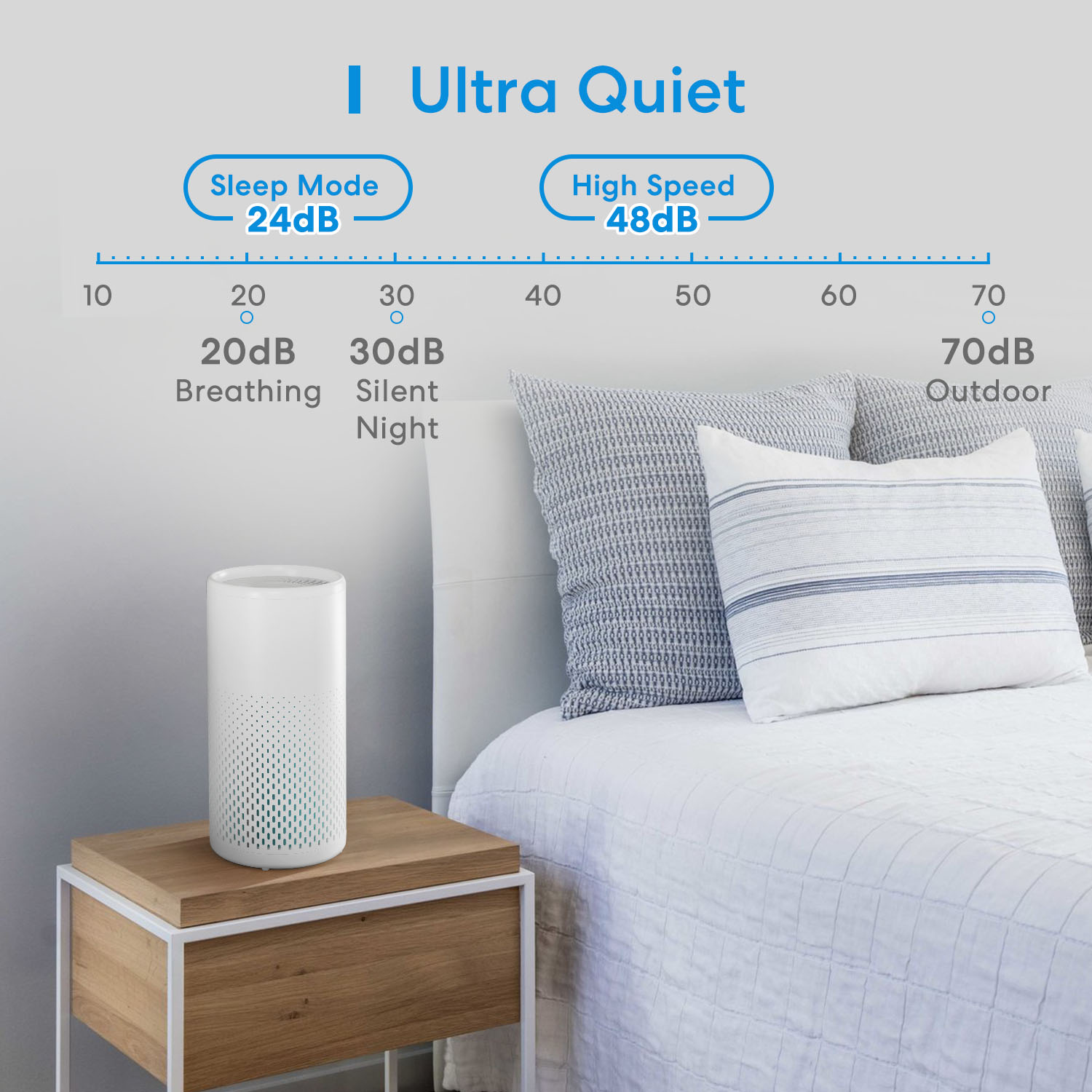 Il corpo è in metallo e il design con fori 360° aiutano a pulire l'aria in modo efficace. Il filtro H13 True HEPA cattura il 99,97% dei contaminanti presenti nell'aria fino a 0,3 micron, liberando l'ambiente da polvere, polline, peli di animali domestici, spore di muffe e altro ancora. Il basso livello di rumorosità di soli 24 dB in modalità notturna garantisce un sonno completamente indisturbato.