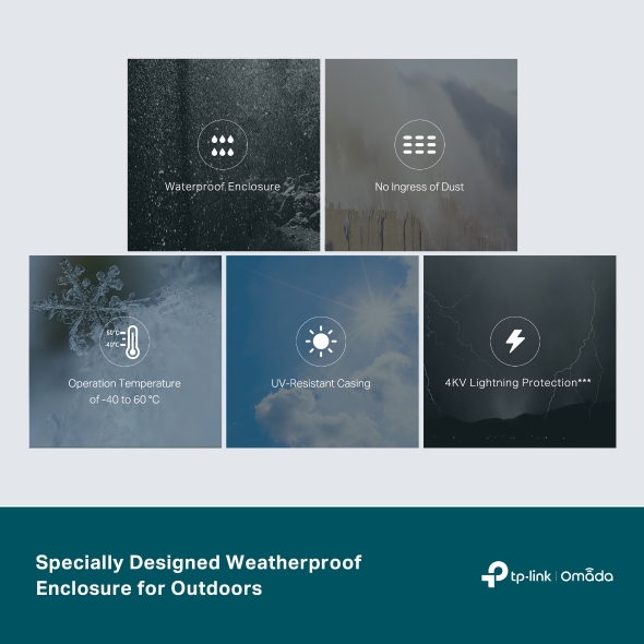 - Installazioni Outdoor: funzionamento stabile in condizioni esterne difficili grazie alla protezione IP55, all'impermeabilità e alla resistenza a polvere e raggi UV. Temperatura operativa tra -40 e 60 °C e protezione dai fulmini 4KV.