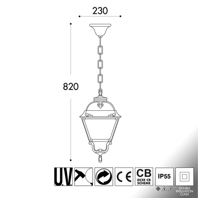 La lanterna a sospensione Schiem/Cefa di Fumagalli è una scelta perfetta per chi cerca un'illuminazione esterna elegante e funzionale. Con un design classico e modulare, è realizzata in resina antiurto, stabilizzata ai raggi UV, e completamente resistente a ruggine e corrosione. Il grado di protezione IP55 la rende ideale per l'installazione all'esterno, protetta da polvere, umidità e dalle condizioni atmosferiche più difficili.