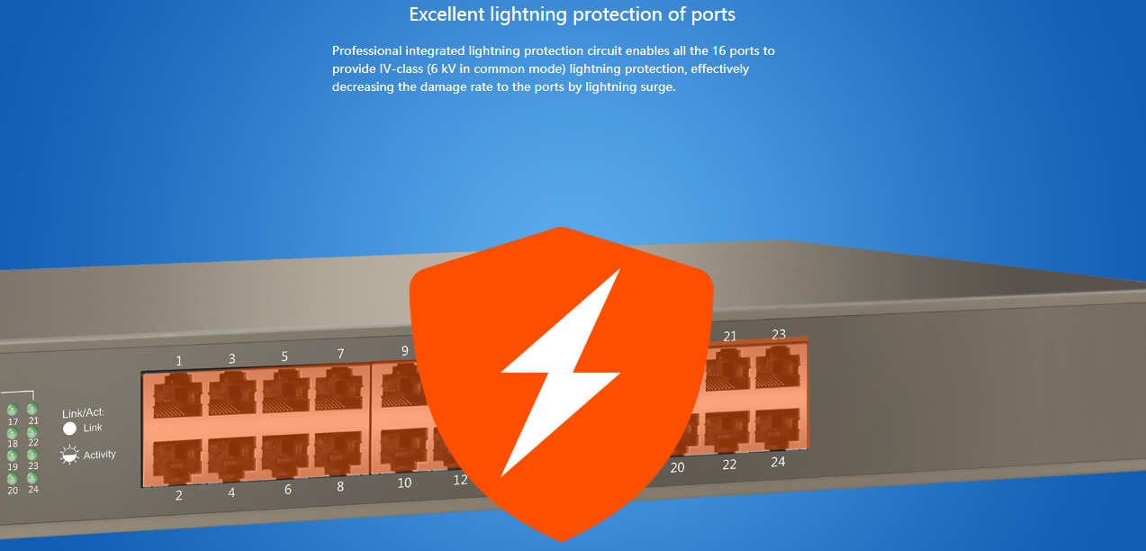 Professional integrated lightning protection circuit enables all the 16 ports to provide IV-class (6 kV in common mode) lightning protection, effectively decreasing the damage rate to the ports by lightning surge.