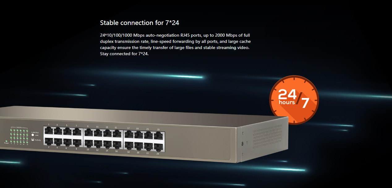 24*10/100/1000 Mbps auto-negotiation RJ45 ports, up to 2000 Mbps of full duplex transmission rate, line-speed forwarding by all ports, and large cache capacity ensure the timely transfer of large files and stable streaming video. Stay connected for 7*24.