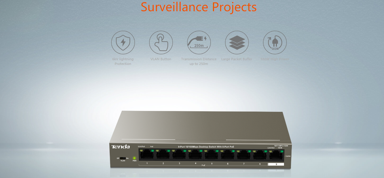 Gli interruttori Tenda TEF11 sono concepiti specificatamente per la protezione da fulmini: una presa da 6 porte KVA e la modalità di alimentazione garantiscono un doppio livello di protezione, riducono efficacemente i rischi per i cavi, il che equivale a dare all'intero sistema di monitoraggio della rete una sicurezza con standard molto più elevati rispetto a ciò che viene richiesto secondo i parametri nazionali. Quando di verifica un temporale, il sistema garantisce un servizio di monitoraggio stabile e affidabile, protegge la trasmissione di dati e fa in modo che questa risulti fluida.