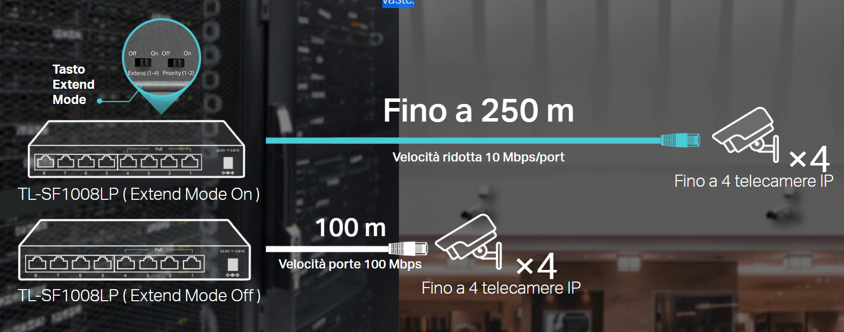 Con l'Extended Mod, TL-SF1008LP è in grado di trasmettere dati e alimentazione fino a 250 m** - perfetto per collegare telecamere IP in aree anche molto vaste.