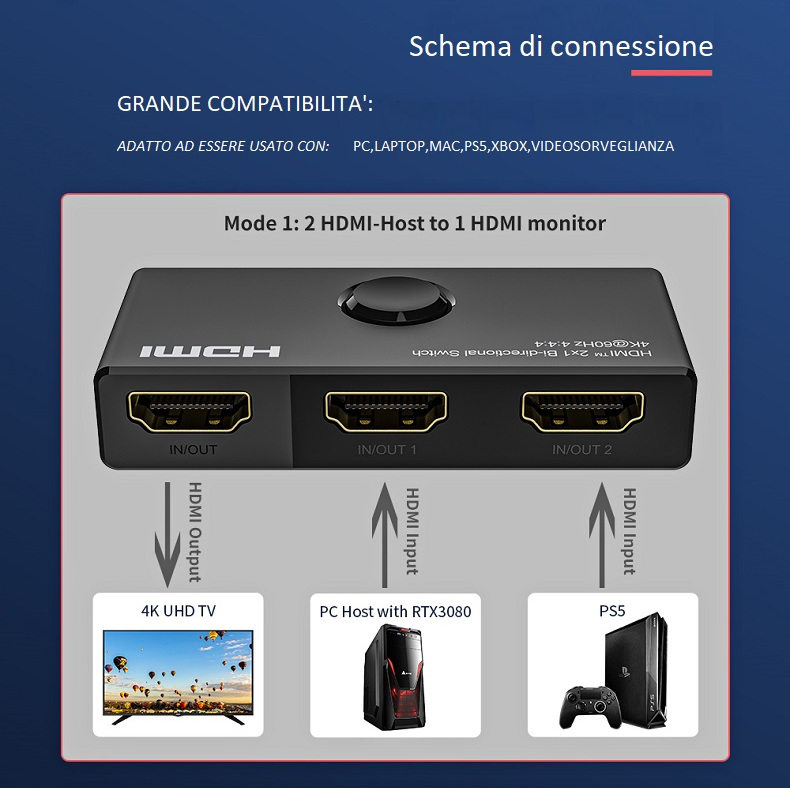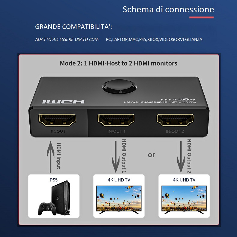 Doppia funzione: puoi collegare due sorgenti HDMI ad un display con uscita HDMI oppure collega una sorgente HDMI per passare da un display all’altro (anche se sarà visibile su un solo schermo)