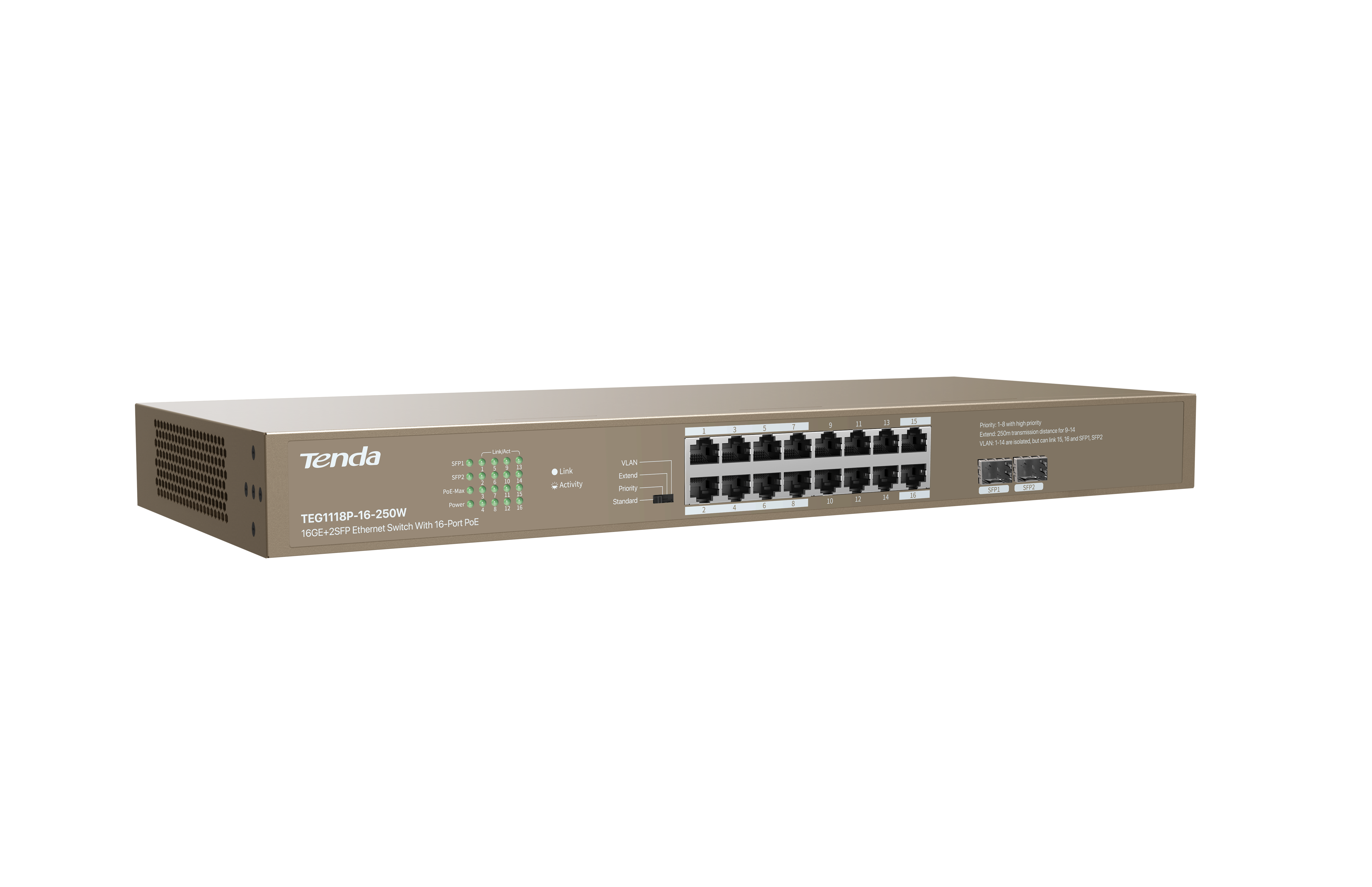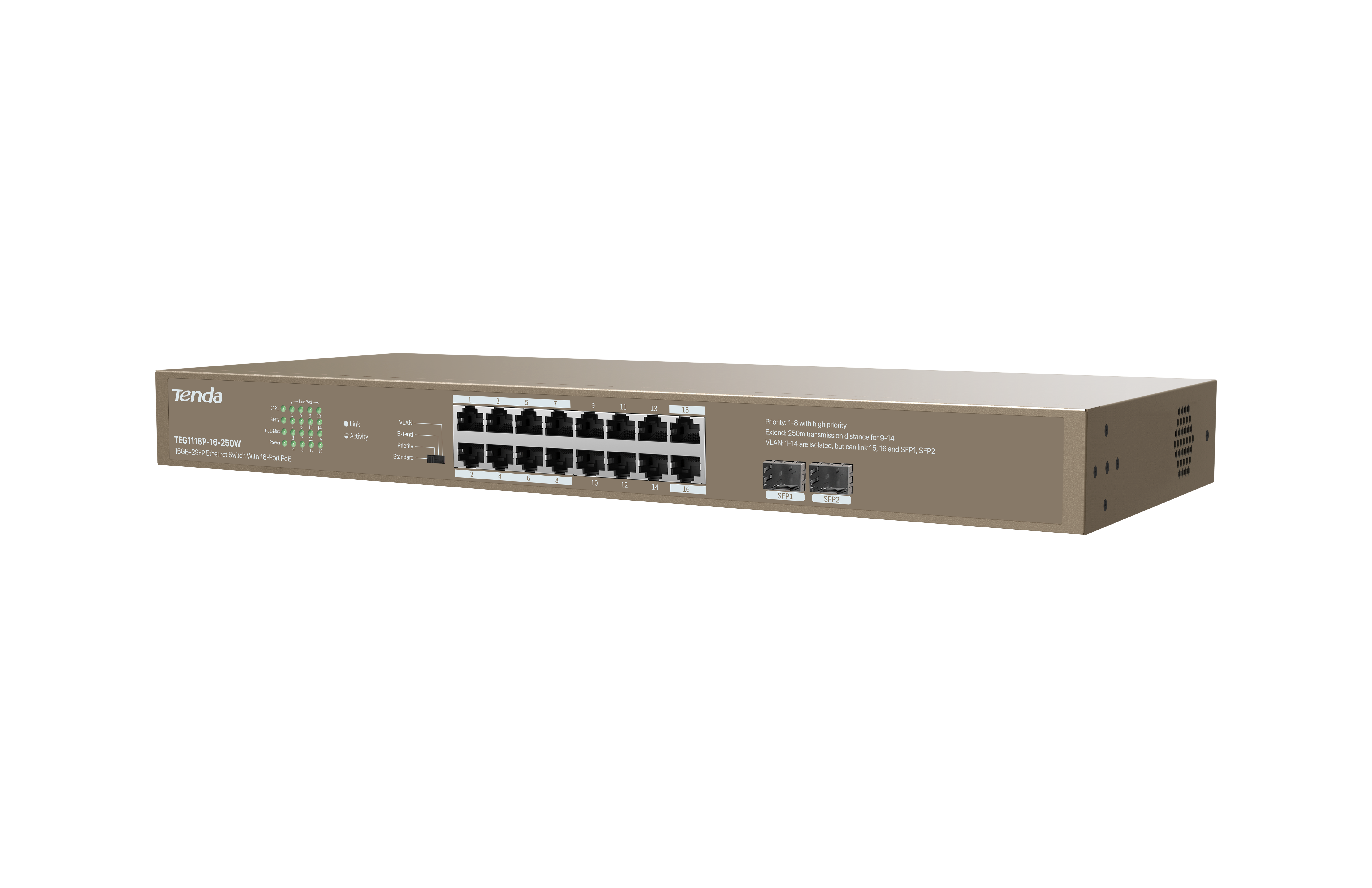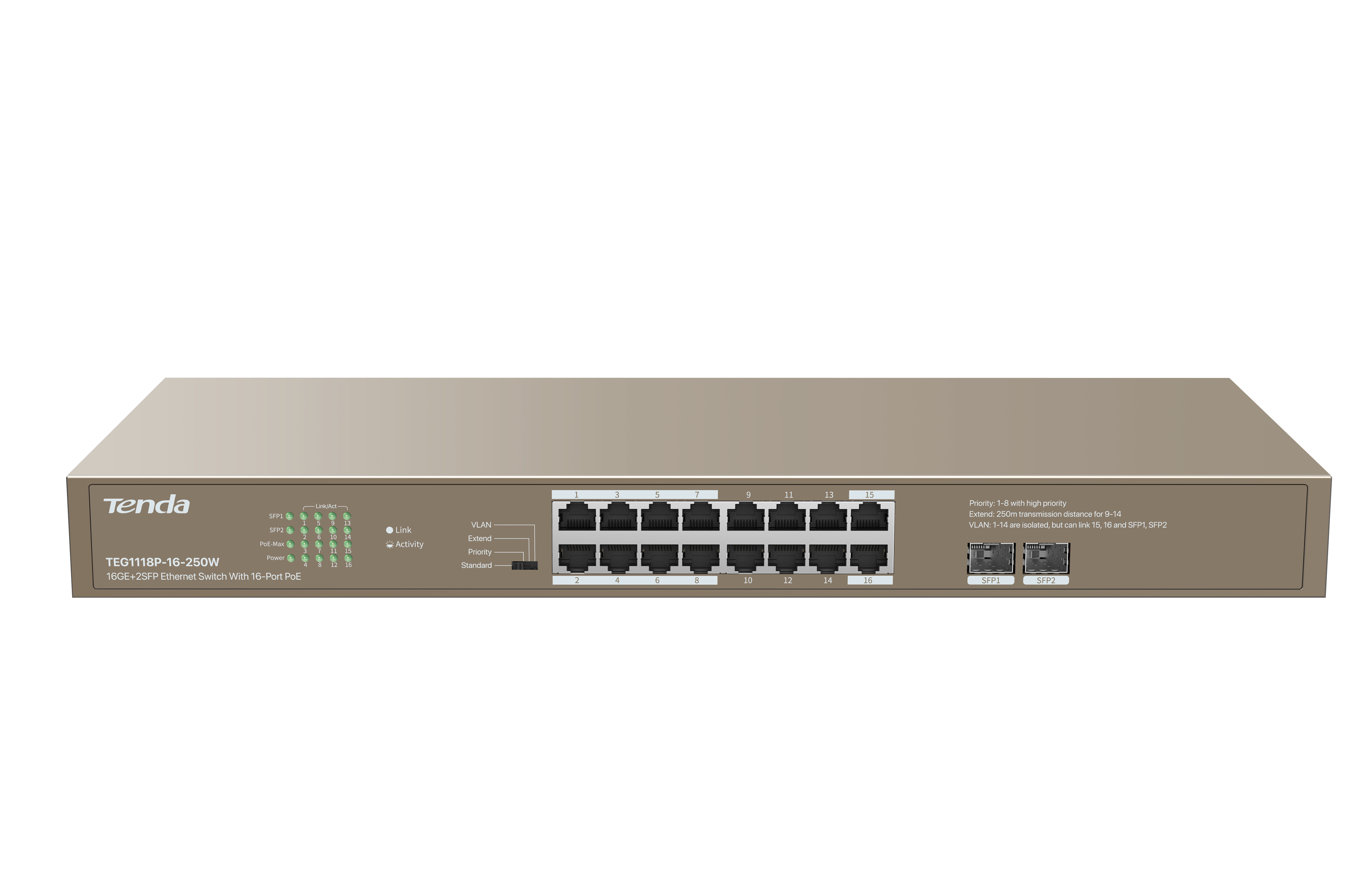 La modalità Standard, la modalità Priority, la modalità VLAN e la modalità Extend rendono TEG1118P-16-250W in grado di gestire reti diverse, speciali per progetti di sorveglianza IP di piccole e medie dimensioni e copertura WI-FI.
