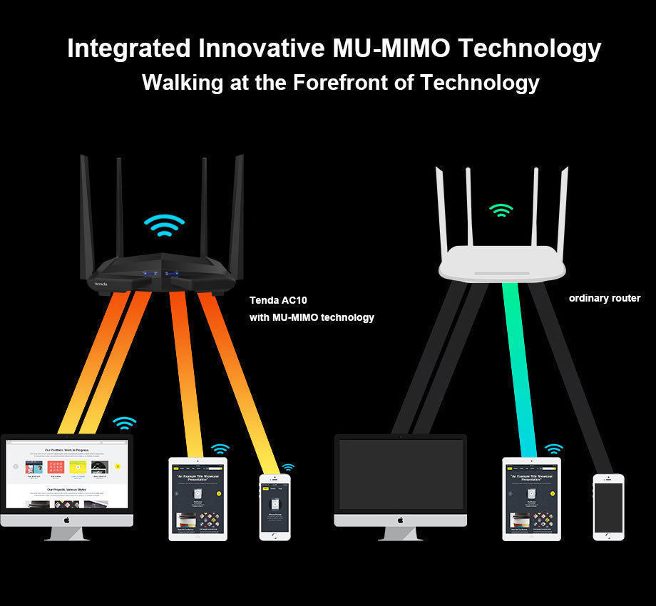 AC10 comes with the next generation 802.11ac wave 2.0 WiFi standard delivering up to 1167 Mbps dual-band wireless speed, which is 3 times faster than wireless 11N speed, enabling stable online gaming and 4K streaming from YouTube and Netflix. With MU-MIMO technology, Beamforming technology, built-in high powered ampliï¬ers and external antennas, AC10 bring long operating range to fulï¬ll greater home coverage and you will never worry about that you have too many devices to connect. Gigabit Ethernet ports give you the fastest, most reliable internet performance. Additionally, Tenda WiFi app provide the smartest way to manage your network local and remotely share fun with your family.