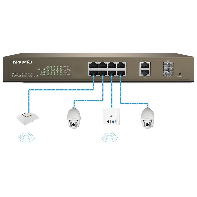 TEF1210P è uno switch PoE Web Smart desktop a 8 porte 10/100Mbps + 2 porte Gigabit TP/SFP. Fornisce 8 porte RJ45 10/100Base-TX, 2 porte RJ45 10/100/1000Base-T e 2 combo 000Base-X SFP.