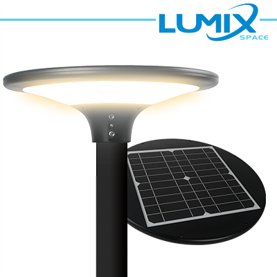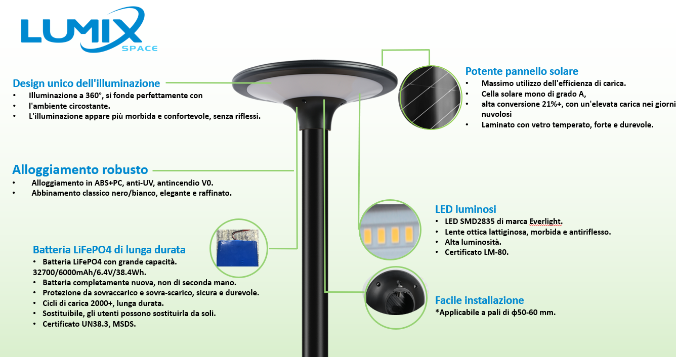 Lampione a batteria con ricarica solare realizzato con pannello fotovoltaico monocristallino integrato nella testa per avere la miglior efficienza di ricarica anche in giornate di poco sole.