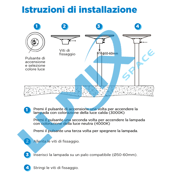 Una volta acceso tramite il pulsante ON/OFF, il lampione entrerà immediatamente in modalità automatica. La gestione automatica del lampione regolerà la luminosità in funzione della capacità residua della batteria.